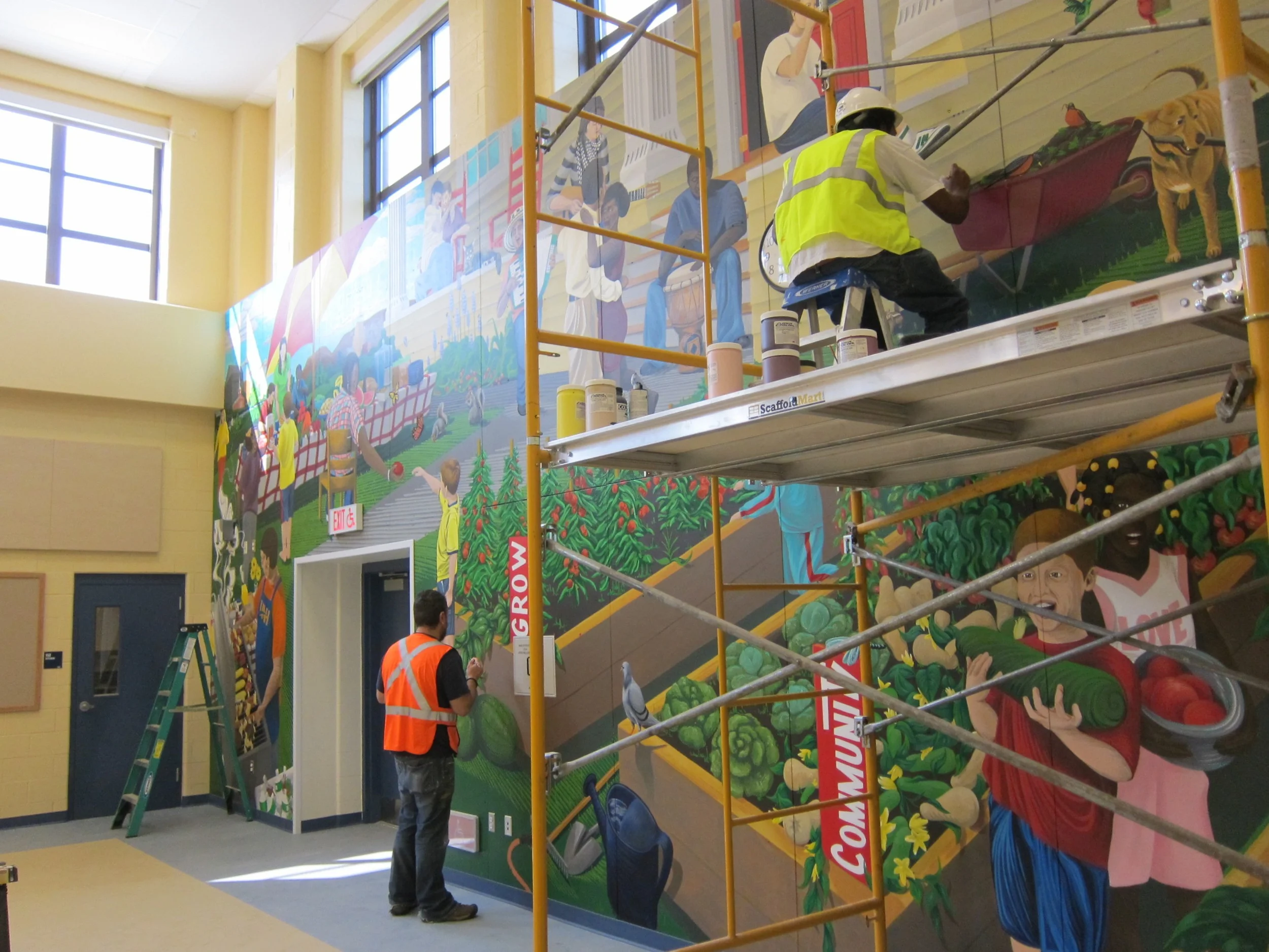 A 16 x 37 foot mural in the new Hill Central school cafeteria in New Haven. It is a mural that depicts a community celebrating the fruits of their labor, specifically in gardening, music, dance, art and family. A community united in the celebration of its cultural diversity makes for a healthier and safer society. Just like fresh vegetables are an integral part of a great salad, so is a diverse multi-faceted people to a thriving community.